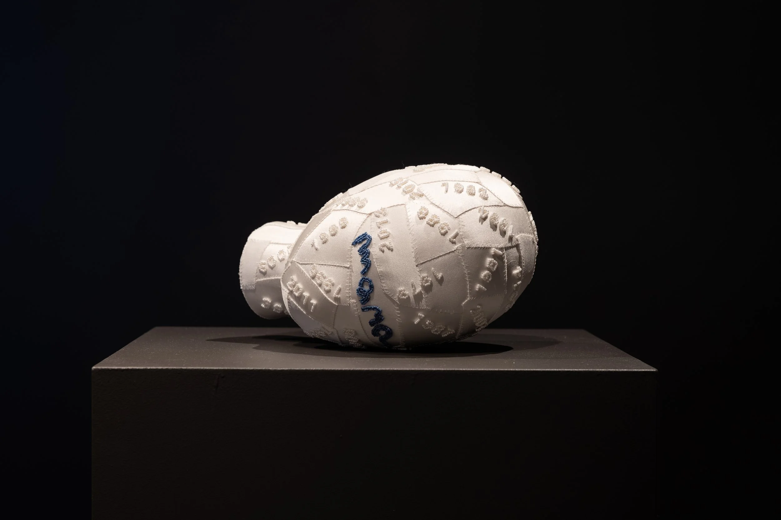Employing a range of mediums, including photography, textiles, sculptures and text, MeiMei Hodgkinson explores the complexities of becoming a mother of two, while her cultural context has promoted the benefits of having only one child for 35 years in China. Her labor-intensive figurative sculptures, made from deadstock silk satin offcuts and Japanese glass beads, reflect the relentless demands of early parenthood. Each piece was made progressively over a 10-month period, between breastfeeding cycles and at nighttime. These works reflects an ongoing journey of understanding the conscious and subconscious ways in which our experiences and culture shape us.