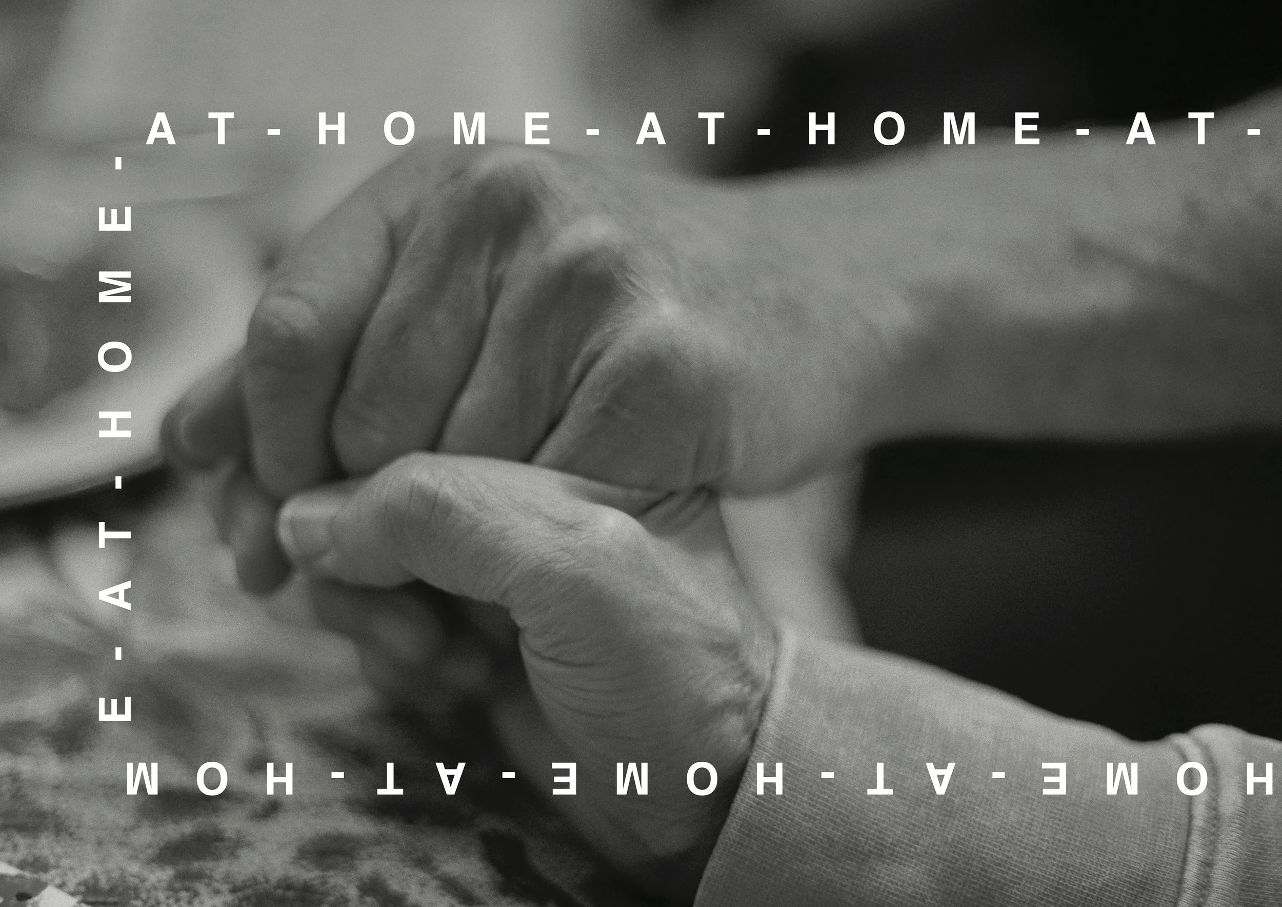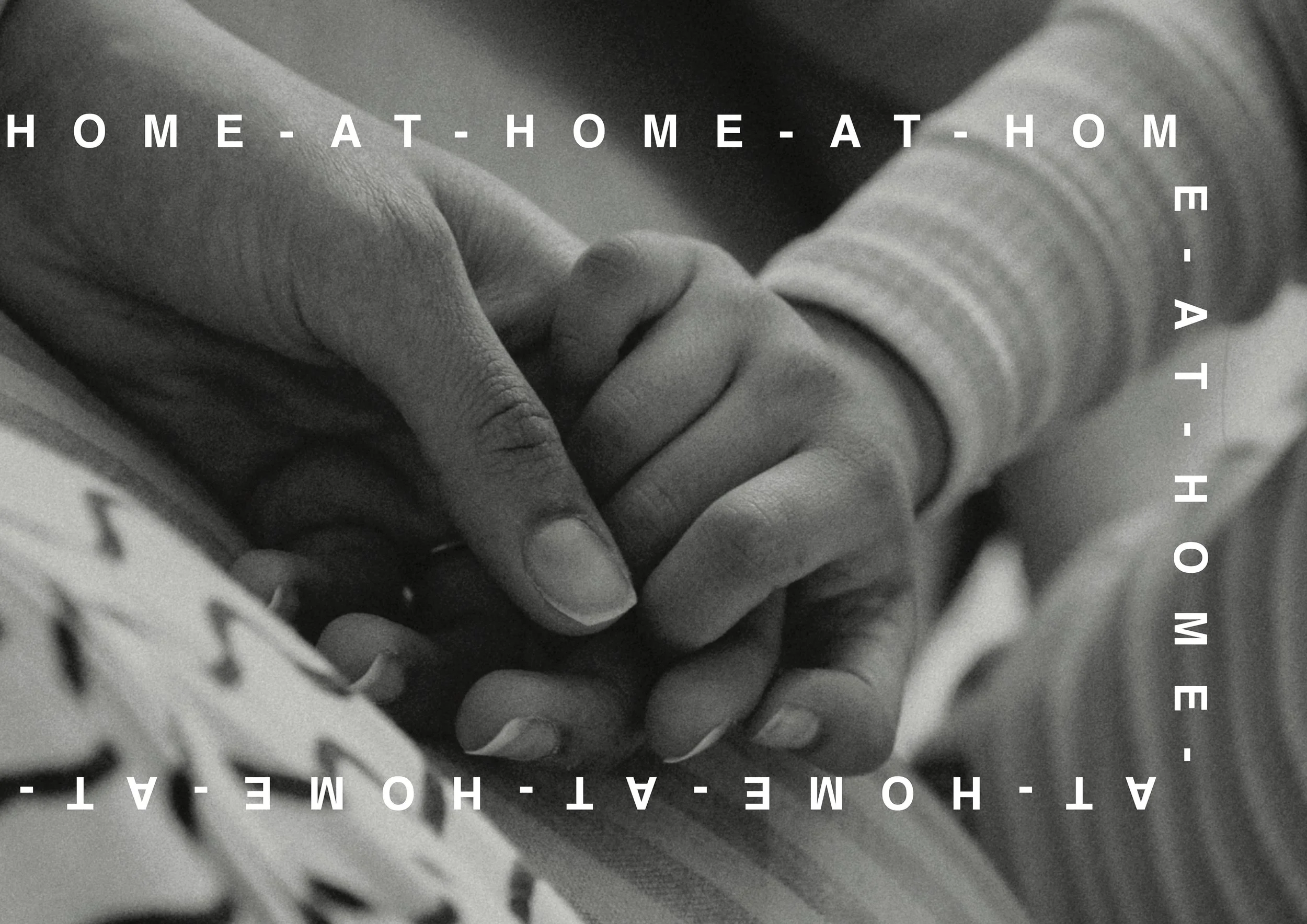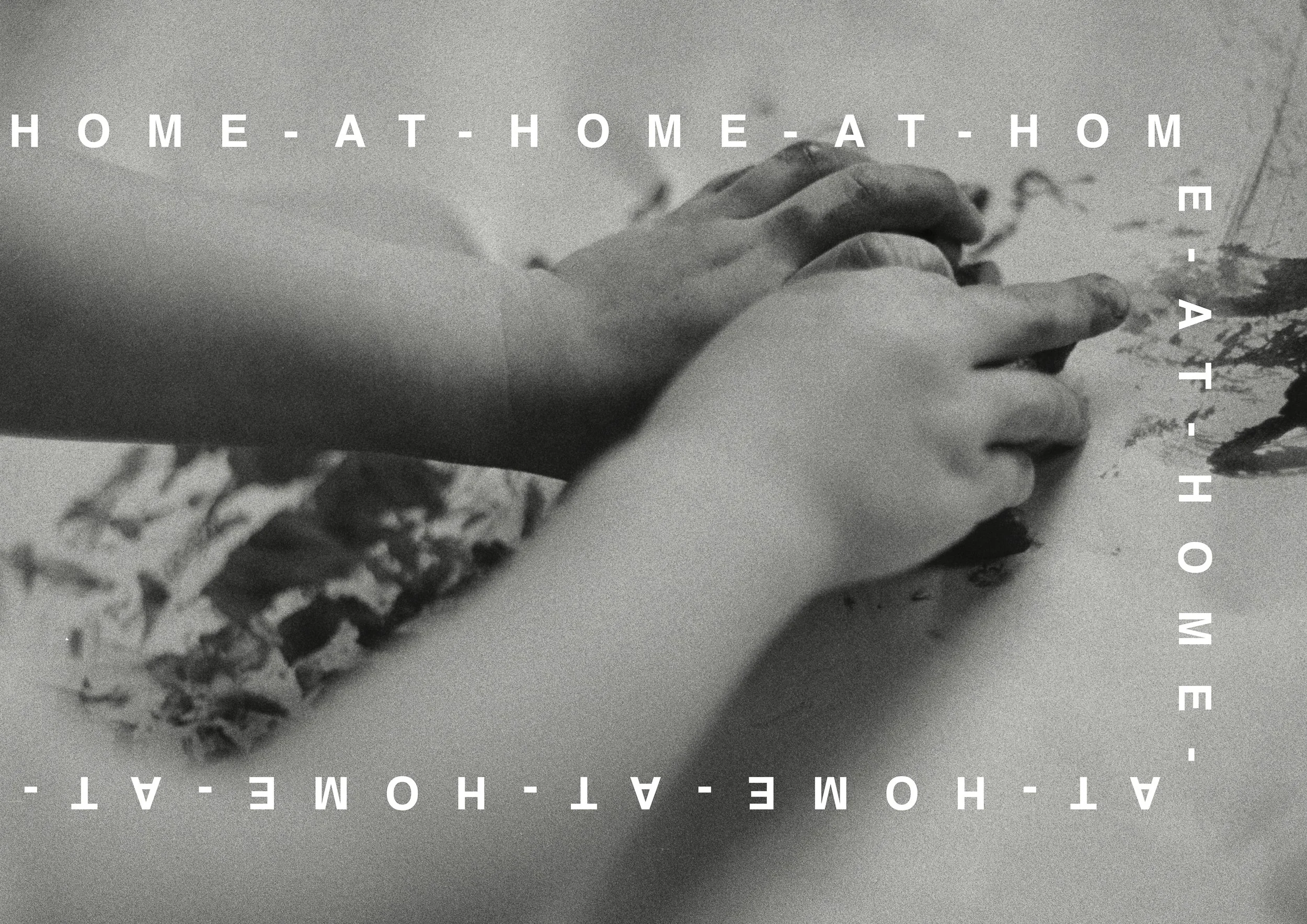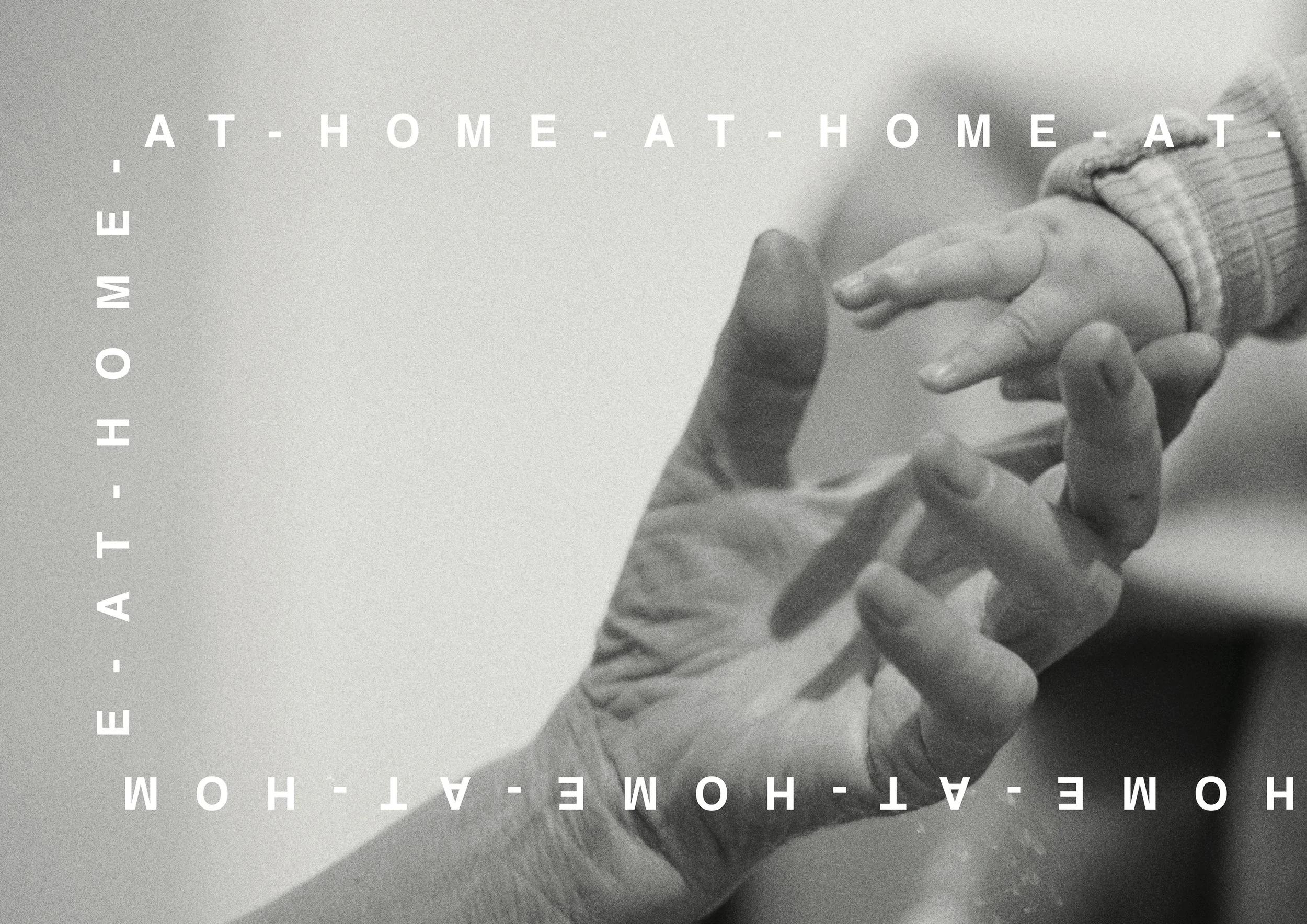 The surrounding repeated text, AT HOME, frames the images - inviting the viewer to reflect on the fundamental human desire to feel a sense of belonging and security within their community.